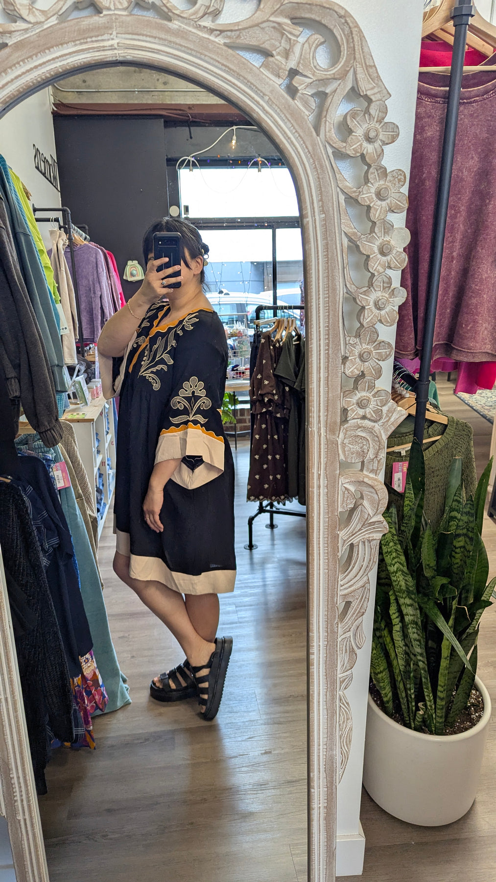 This Plus Size Oddi Embroidered Dolman Mini Dress features a flattering plunge V-neckline and detailed embroidery complemented by contrasting bands for a refined look. Crafted from 100% polyester, it offers both comfort and easy care. With a total length of 38 inches, this dress is designed to provide a stylish fit in sizes S to L, making it a versatile addition to any wardrobe for polished occasions.