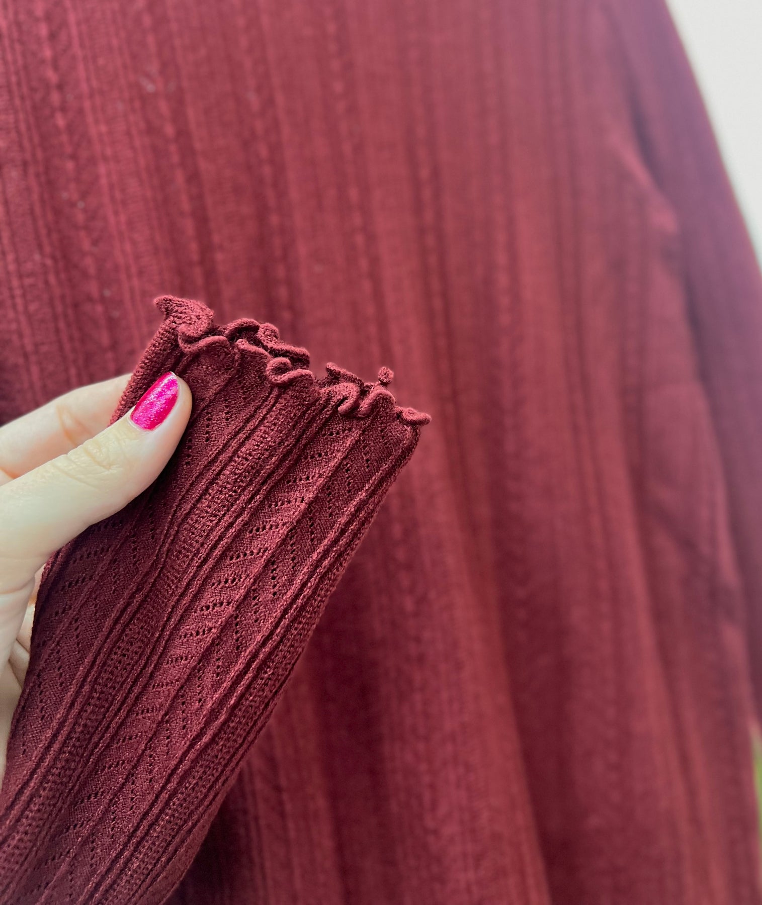 This ribbed knit top features long sleeves and a delicate lettuce hem for a refined silhouette. So 90's! Its textured fabric offers gentle stretch for comfort and layering versatility, making it a sophisticated choice for both casual and polished outfits.